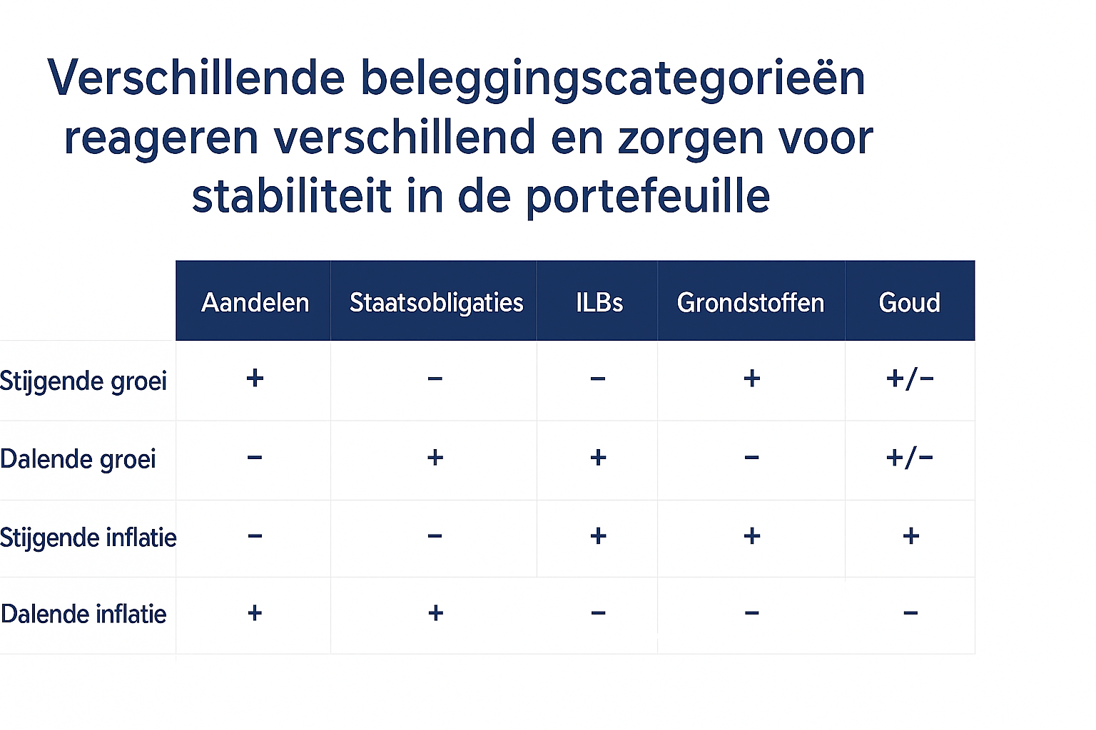 We beleggen breed gespreid – in aandelen, obligaties, inflatie gerelateerde obligaties, grondstoffen en goud– zodat jouw vermogen meebeweegt met de economie, wat er ook gebeurt.